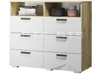 Наличие шести выдвижных ящиков позволит разместить большое количество вещей, на двух открытых полках можно хранить технику или книги, комод Азаро выделяется белыми глянцевыми фасадами и эргономичными хромированными ручками на фоне корпуса в цвете венге.