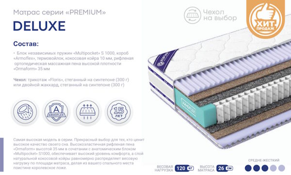 Cамая высокая модель в серии. Прекрасный выбор для тех кто ценит высокое качество своего сна. Высокоэластичная рифленая пена «Ormaform» высотой 35 мм в сочетании с анатомическим блоком «Multipocket» S1000, обеспечивает высокий уровень комфорта, а слой натуральной кокосовой койры равномерно распределяет весовую нагрузку по площади матраса, делая из вашего спального места поистине королевское ложе.
